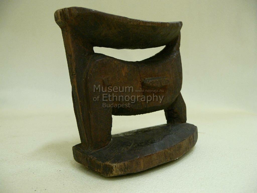 Egy darab keményfából kifaragva. Színe sötétbarna. A fejalj felső része hajlított, alsó részét lekerekített sarkú téglalap alakú lap képezi. A két lapot durván faragott madáralakú faragvány köti össze.