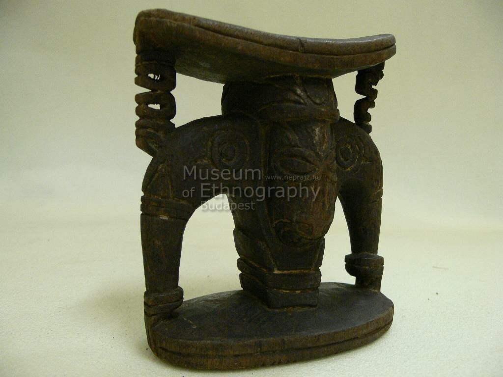 Egy darab keményfából kifaragva. Színe sötétbarna. A fajai hajlott ovális alakú lap, alsó részét szintén hajlott ovális alakú lap képezi. A két részt középen álló emberalak fargavány köti össze A törzs igen rövid, lábai nincsenek. Két karja az alsó laphoz ívben kapcsolódik. A vállaktól felfelé jabósor emelkedik ami a fejjel együtt tartja a felső lapot. Az arc kiemelkedően faragott, a vállaknál és atérden körök jelzik az izületeket. A háton vonalas és körmintás díszítések láthatók.