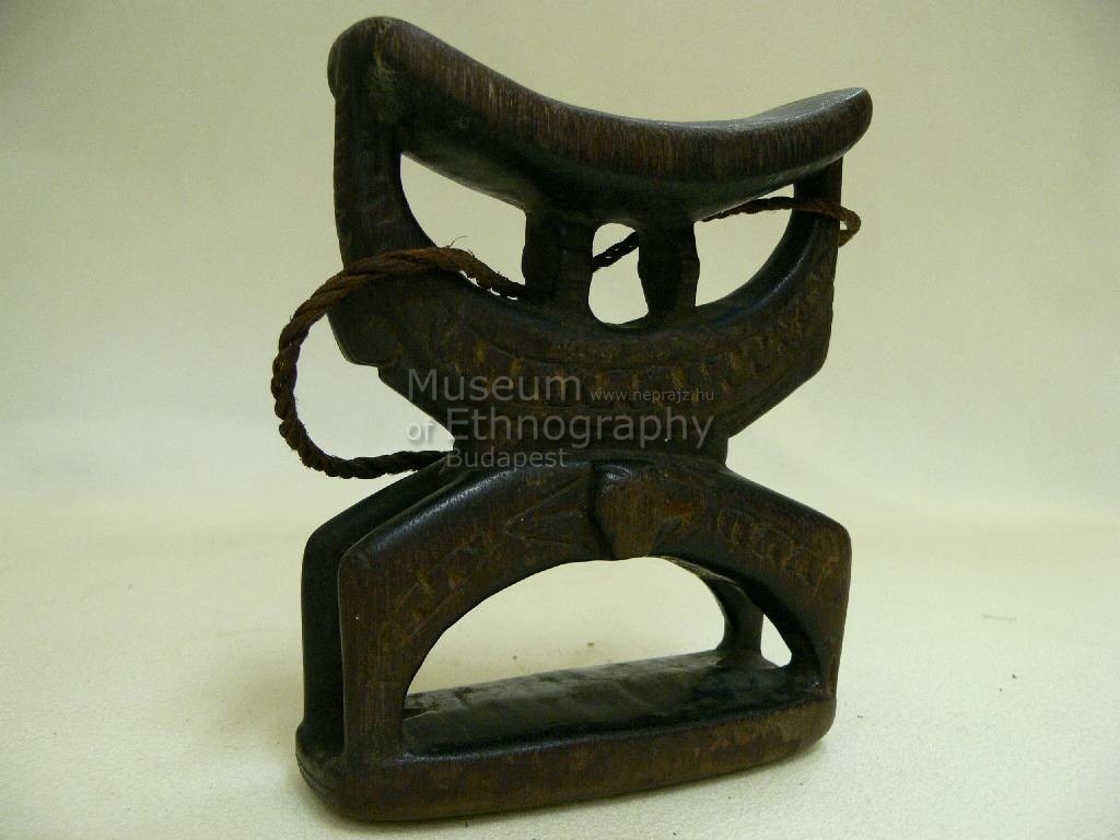 Egy darab keményfából kifaragva. Színe sötétbarna. A fejalj felső része hajlított ovális alakú, alsó részét téglalap alakú lap képezi. A két lapot két, egymásnak ellentétesen álló ív köti össze, amelyek közül az alsó, csőrükkel az alsóhoz kapcsolódó, stilizált madarakat ábrázol. A találkozásnál az alsó íven mindkét oldalon fejalakú domborodás van kifaragva. Az ívekre farkasfog minta van vésve.
