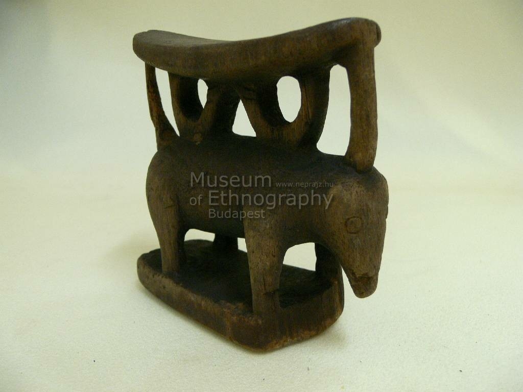 Egy darab ráboen (Afzelia bijuga) vagy miti (Calophyllum) fából faragott, három részből álló tárgy. A letámasztásra szolgáló, enyhén domború talprészt (kek) áttört figurális elem kapcsolja a fejet tartó homorú felső részhez (tándán). A középső részt alkotó állatfigurát (disznó?) két-két gyűrűszerű, illetve ívelt elem köti össze a fejtámasztó résszel.