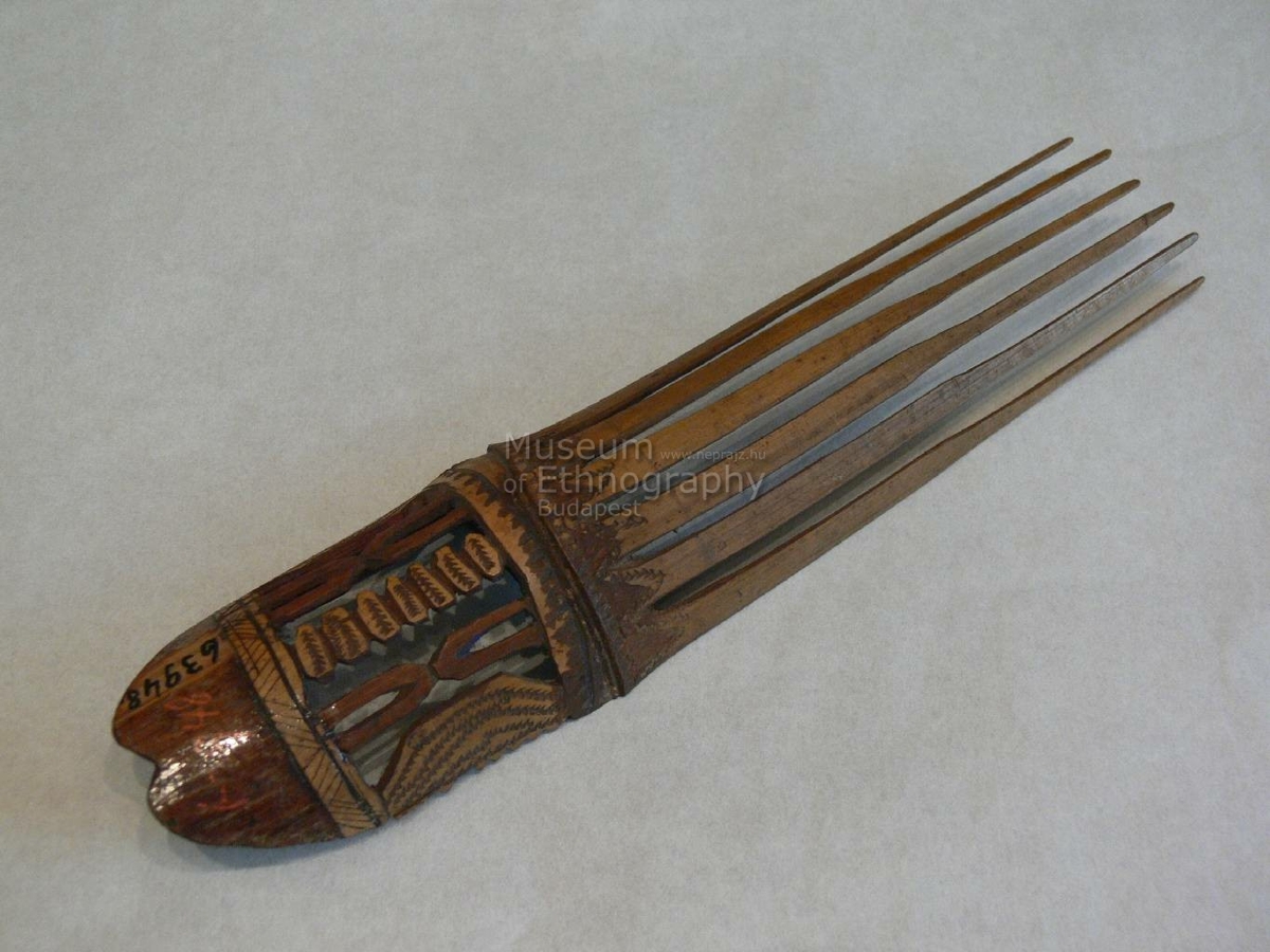 Bambuszból készített, sárgás-barnás színü, szélességében kissé hajlított, hosszúkás téglalap alakú tárgy. A bambusz nódusza két részre eosztja: felső része áttörésekkel és faragásokkal díszített, részét hat hegyes ág képezi. Bíró-jegyzet: 55o/a.