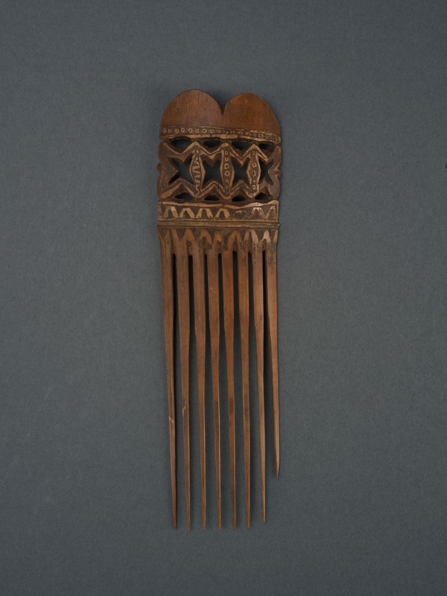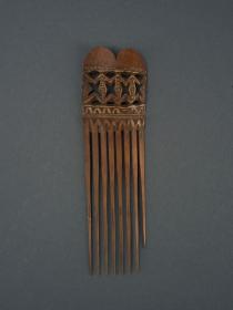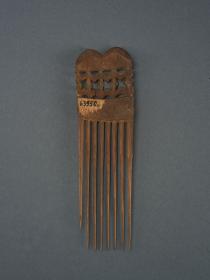 Sötétbarna színű, hosszúkás téglalap alakú, bambuszból készített, szélességében gyengén hajlított tárgy. A bambusz nódusza két részre tagolja: felső része áttört faragással díszített, alsó része nyolc hegyes ágból áll, amelyek közül az egyik szélső rövidebb a többinél. Bíró-jegyzet: 55o/a.
