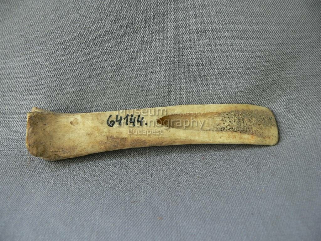 Sárgás színű, hosszúkás, kés alakú, egyik oldalán sima, másikon recés, ugyanitt lecsiszolt, félhosszúságig vájattal rendelkező csontdarab.