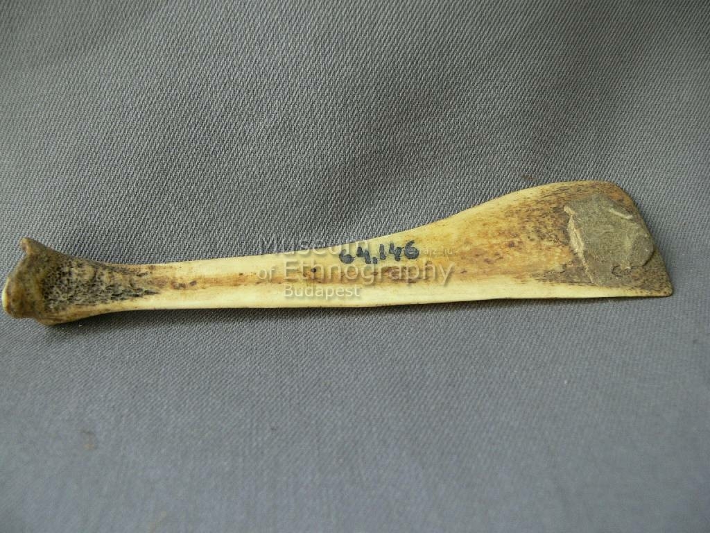 Sárgás színű, hosszúkás, egyik végén ellaposodó és kiszélesedő, egyenesen levágott, másikon görcsös, egyik oldalán sávban elhelyezkedő karcolt vonalakból álló díszítésű csontdarab.