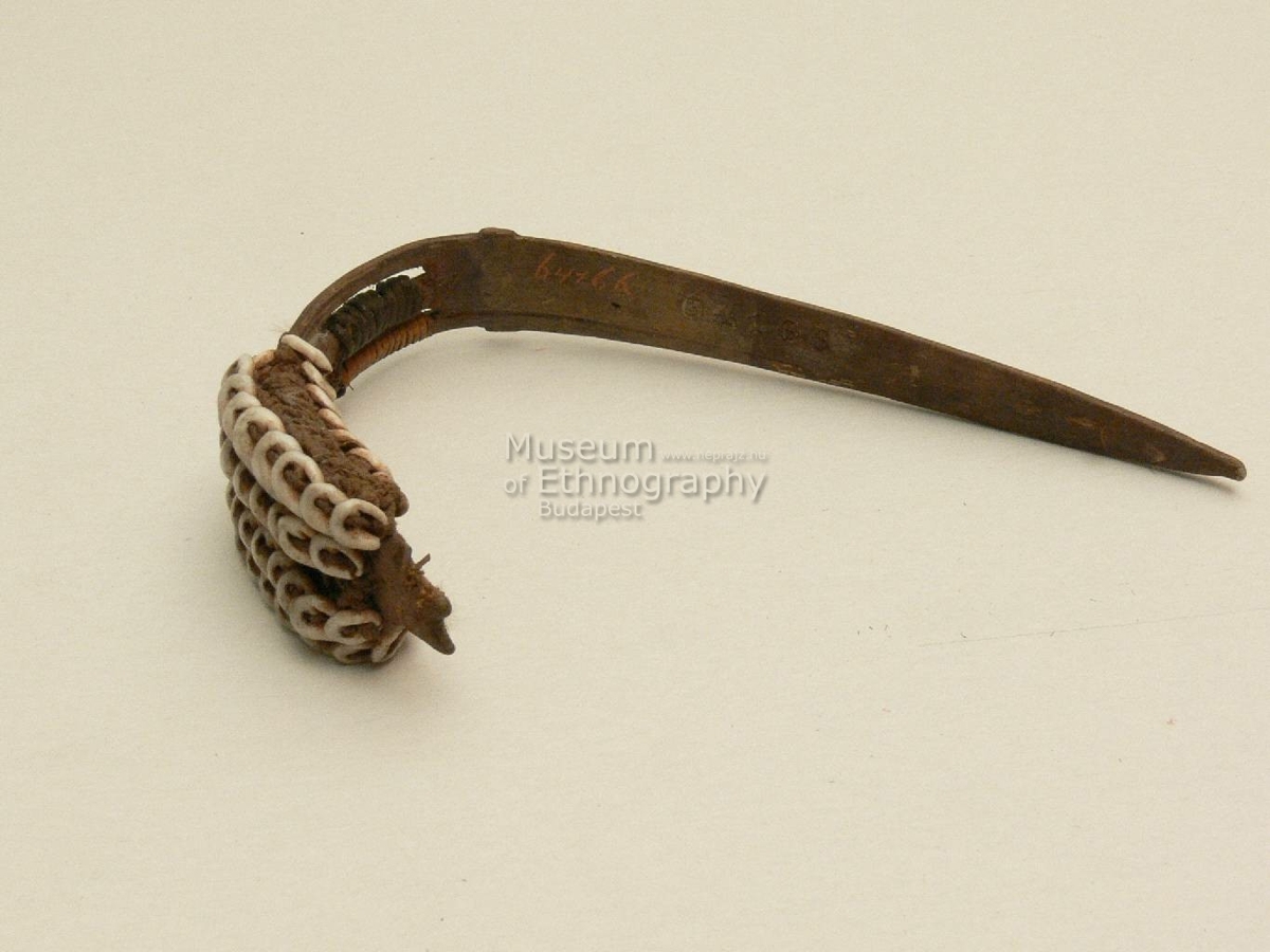 Barnás színű, fából hajlított, lapos tárgy, alul hegyben végződik, felső része közel derékszögben meghajlik, a hajlásnál két helyen áttört, felső részén rostra felfűzött fehér kagylóhéjak vannak erősítve, hátul egy-egy, elöl két-két sorban. Bíró-jegyzet 602