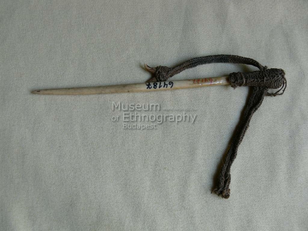 Sárgás színű, egyik végén hegyes, emberi alsókarcsontból készített tárgy, amelynek egyik végére sodrott rostzsinórból való fonadék van erősítve. A fonadéknak két szárnya van, az egyik szárny végén két kis fog látható. Bíró-jegyzet: 562/c