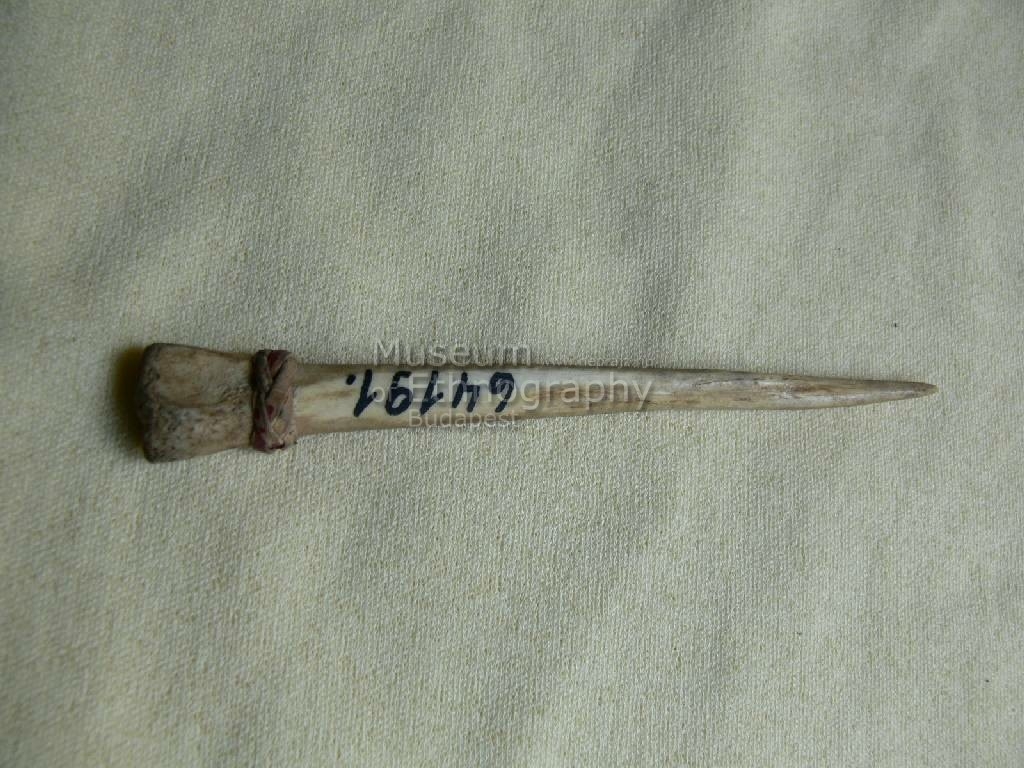 Sárgás-fehéres színű, egyik végén hegyes csontocska. Bíró-jegyzet 562.