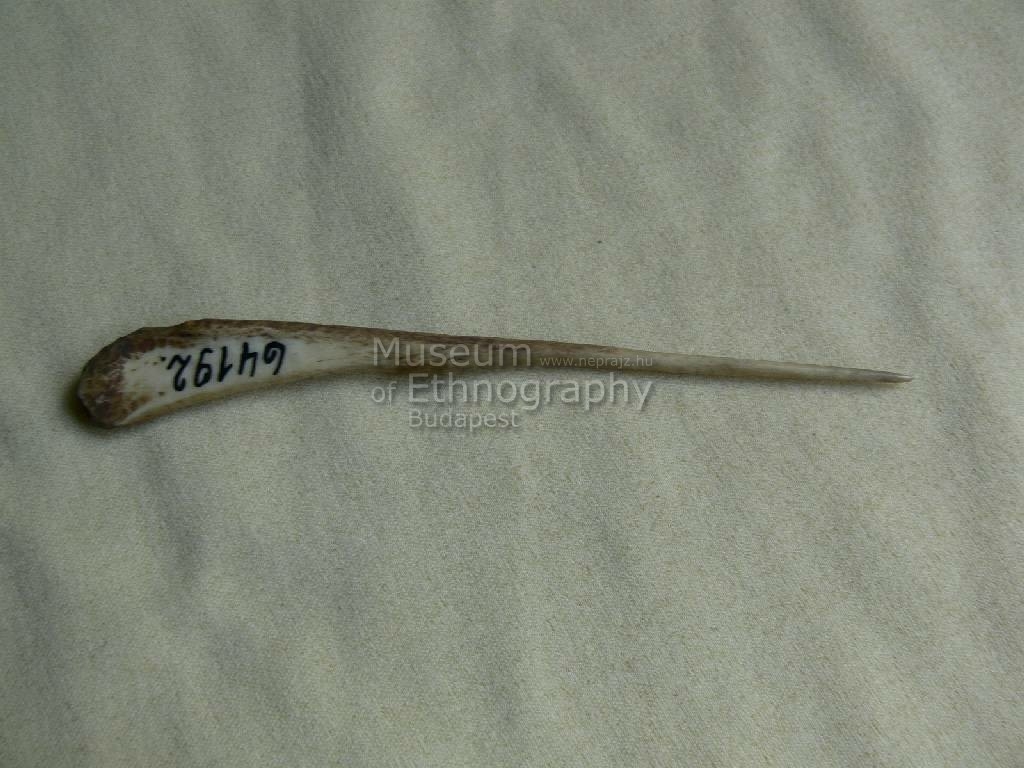 Sárgás-barna színű egyik végén hegyes csont. Bíró-jegyzet 587.