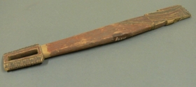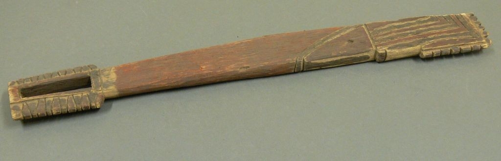 Lapos, puha faanyagból készített faragvány. Felső végét mélyített fehérrel inkrusztált vonalak díszítik, a vonalak közötti terek váltakozva vörös és sötétkék színre vannak festve. Fogójának vége áttört, kétoldalt bevagdalásokkal díszített. Felső része letörött. Bíró-jegyzet: 584/b.