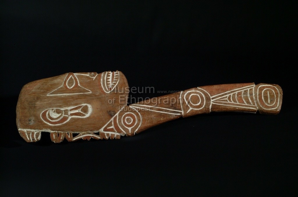 Hosszúkás, lapos keményfából faragott tárgy. Széles rész lapos arcot ábrázol. Szeme, szája, fogai, fülei valamint szemfestési mintája és fülbevalója vésett és fehérrel inkrusztáltak. Feje hátsó részén áttört faragások, nyakán jabo. Nyelén azonos módon készített geometrikus minták. Helyenként vörös festés nyomai.