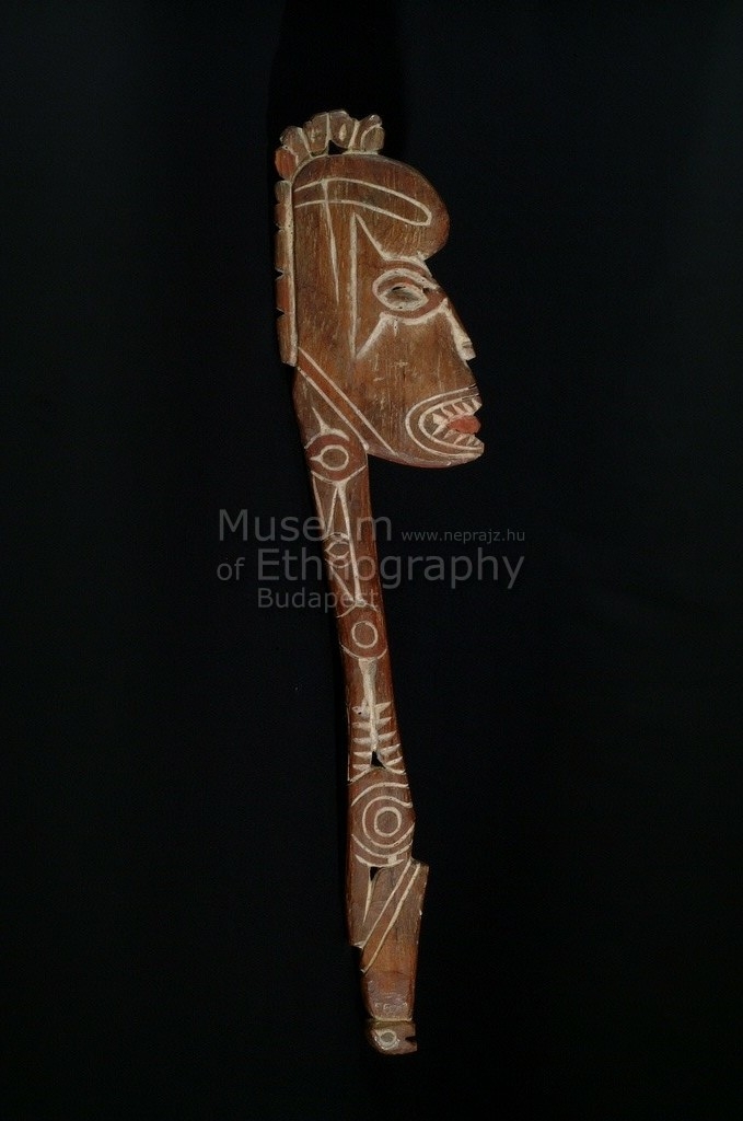 Keményfából készített lapos, hosszúkás tárgy. Felső része kiszélesedik, emberarcot ábrázol. Az arcvonásokat mélyített vonalak jelzik, a szemek körül szemfestési motívum látható, a fűrészfogszerűen kiképzett fogak között pedig a pirosra festett nyelv. Nyele egy helyen áttört, végén madárfej alakú faragvány van. A nyelet mélyített vonalakból álló geometrikus motívumok díszítik. Az arc felső részén és hátul jabó-sorok vannak. A mélyített vonalak fehérrel vannak inkrusztálva.