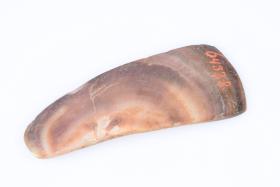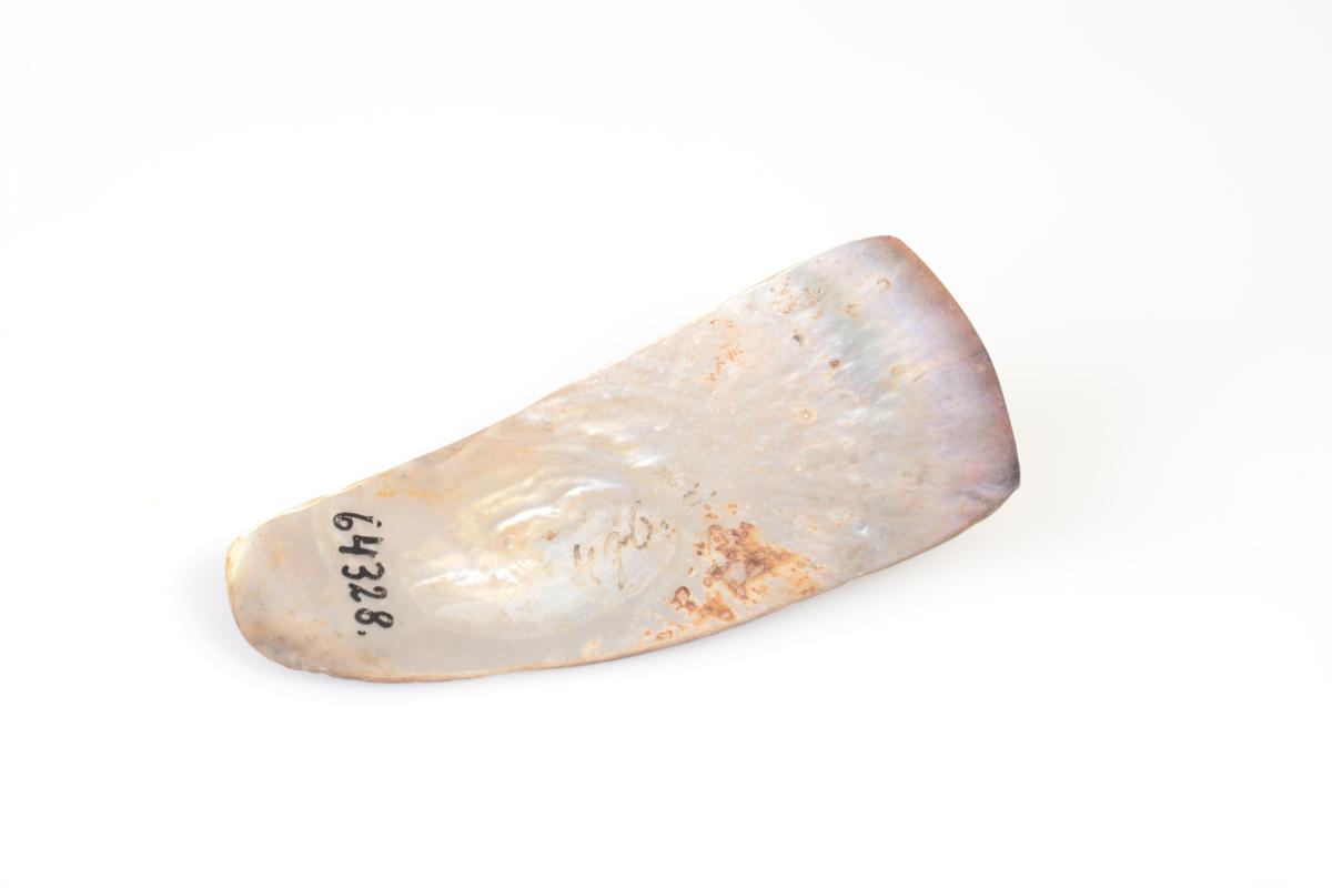 Kagylóból készített sima, egyik oldalán fehéres, gyöngyházfényű, másik oldalán barnás színű hosszúkás trapéz alakú, szélesebb végén elvékonyodólap.