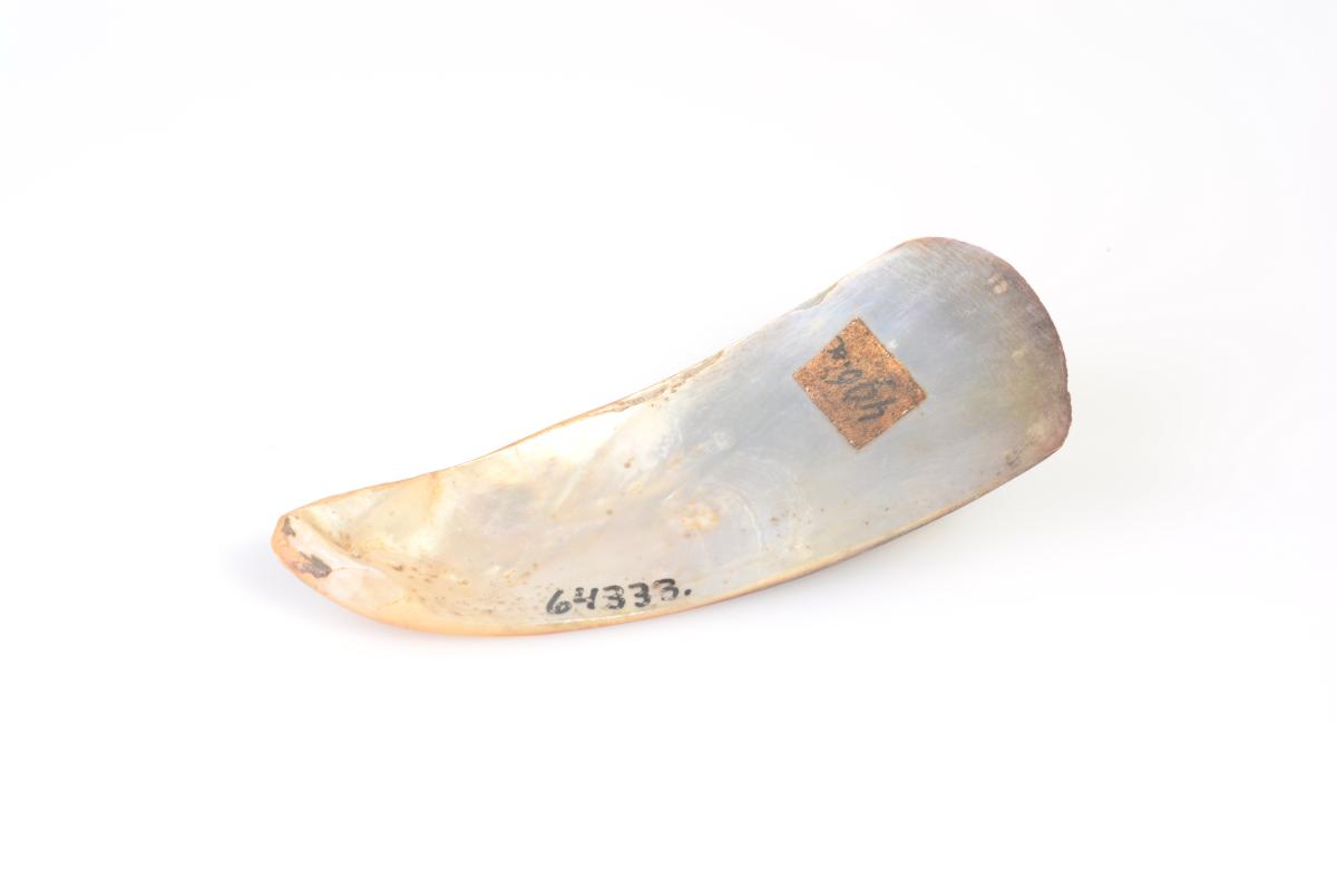 Kagylóból készült, sima, háromszög alakú, enyhén hajlított, egyik oldalán fehéres, másikon gyöngyházszínű és szürkés-barnás lap.