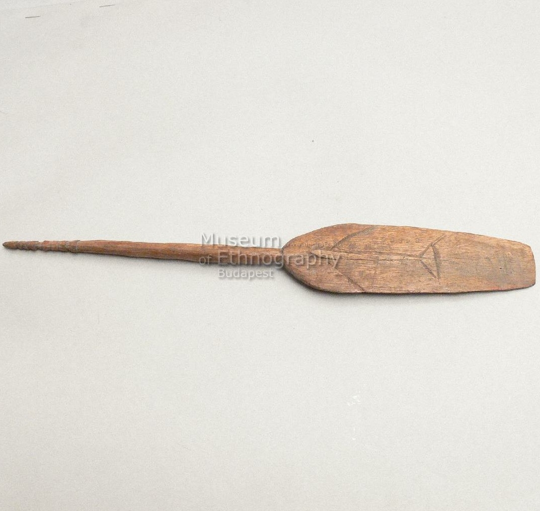Evező alakú fából készült, hosszában kissé hajlított tárgy, lapátrészén egyik oldalán hal alakú faragvány, másik oldalán geometrikus mintákkal. A nyél vége gyűrű alakú, faragott. Bíró jegyzet 584.