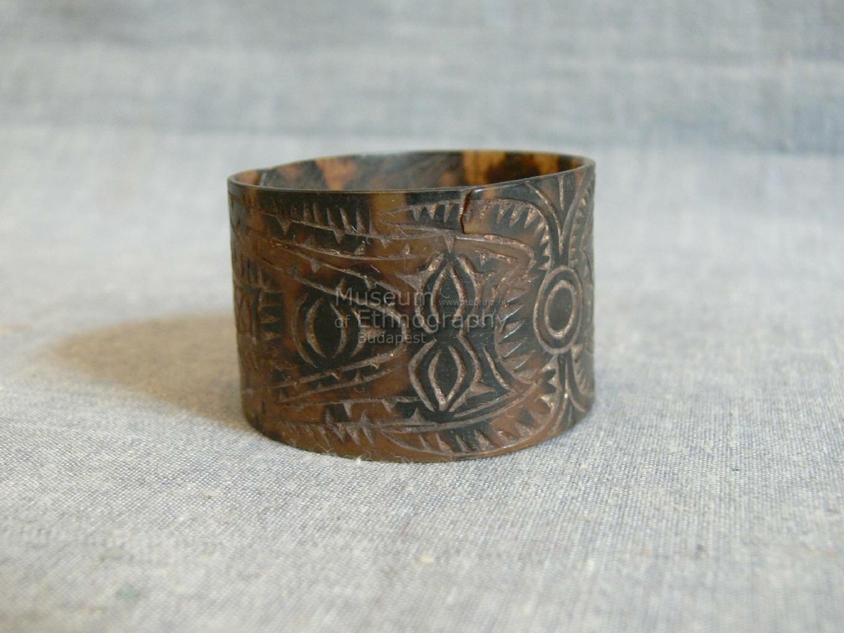 Hengeresre hajlított teknőshéj. Szine sötétbarna világossárga áttetsző foltokkal. Végei egymásra hajlanak. Külső felületén vésett geometrikus mintáza borítja.
