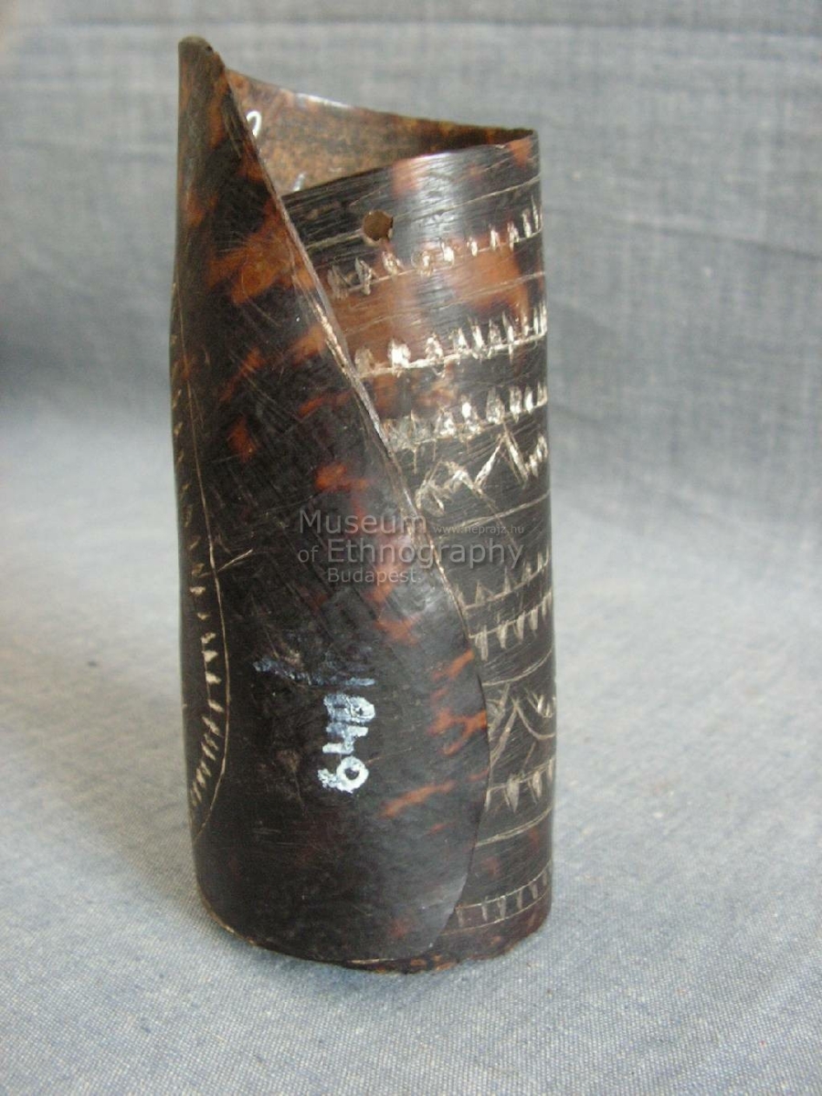 Hengeresre hajlított teknőshéj. Szine sötétbarna világossárga áttetsző foltokkal. Végei egymásra hajlanak, szélei repedezettek. Külső felületén karcolt geometrikus minta borítja, fehérrel inkusztálva. Négyzet alakú felületét farkasfoggal kitöltött párhuzamos vonalak határolják. Két KANKAN, egyiket csillagszerű nyúlványok veszik körül az egyik oldalon, a másikból több, farkasfoggal díszített vonal indul. Egy helyen lyukkal.
