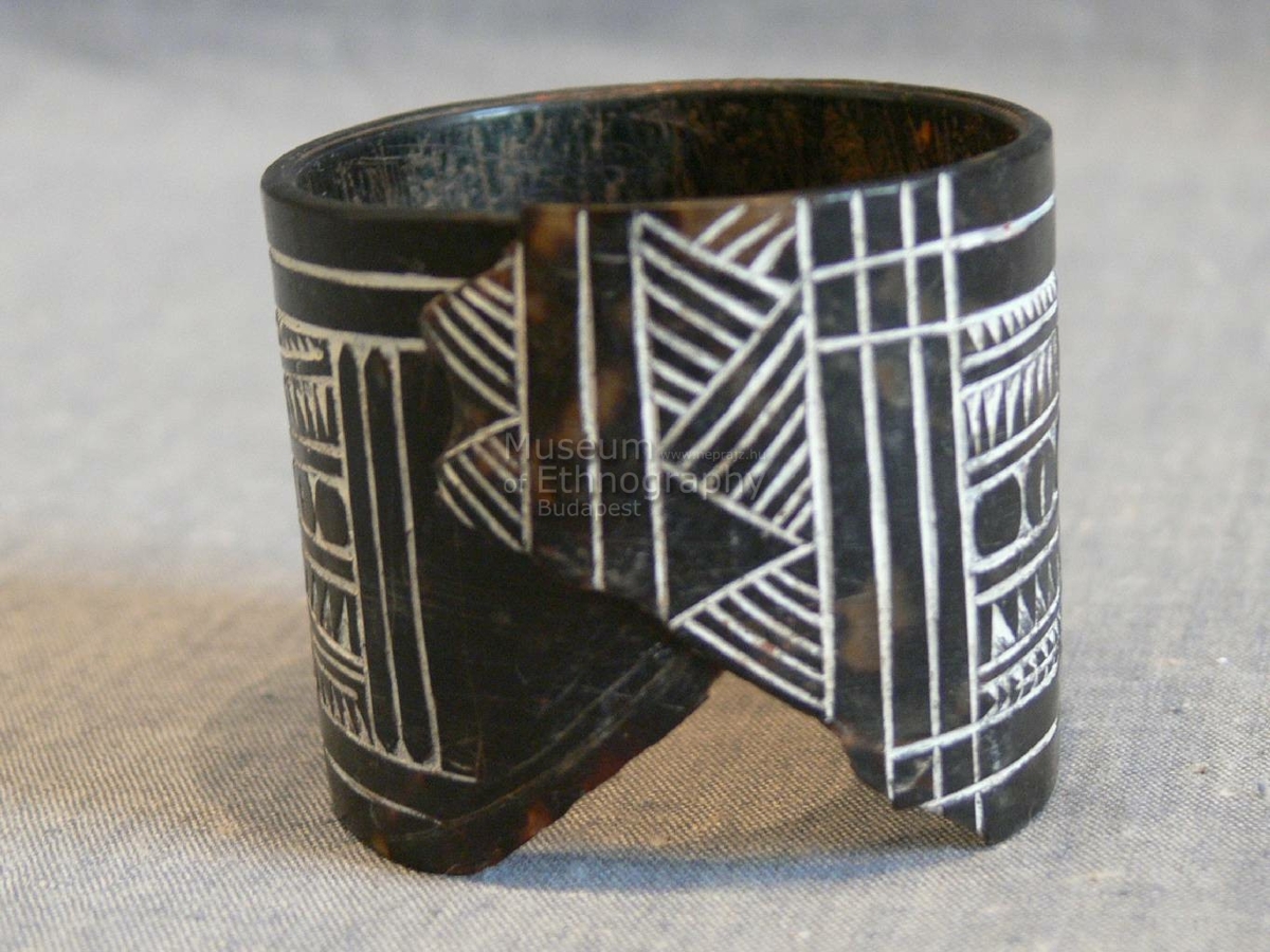 Hengeresre hajlított teknőshéj. Színe sötétbarna világossárga áttetsző foltokkal. Végei egymásra hajlanak. Külső felületén vésett geometrikus mintázat borítja, fehérrel inkusztálva. A vízszintes oldalaival párhuzamosan két párhuzamos vonal fut, a belső részen a következő minta található: középen KANKAN minta, két oldalán szimmetrikusan középről a széle felé haladva: fenn és lenn egy-egy KIKUM; fenn és lenn párhuzamosan a KIKUMok szárát farkasfog veszi körül; beljebb félkörön belül farkasfog, párhuzamosok és kerek KEMATEN sor amiben csak minden második üreges.