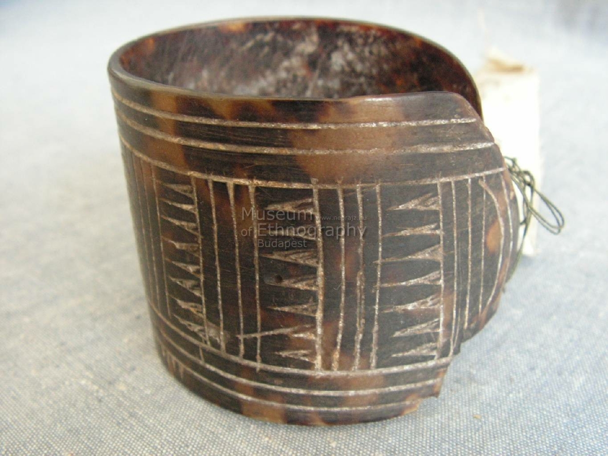 Hengeresre hajlított teknőshéj. Színe sötétbarna világossárga áttetsző foltokkal, végei egymásra hajlanak, szélei repedezettek. Külső felületén felületesen vésett geometrikus mintázat borítja. A vízszintes oldalaival párhuzamosan 6 párhuzamos vonal fut, középen széles csíkot szabadonhagyva, melyet függőleges vonalak és farkasfogak töltenek ki. Textilcédulán Bíró jegyzet száma: 571 ii.