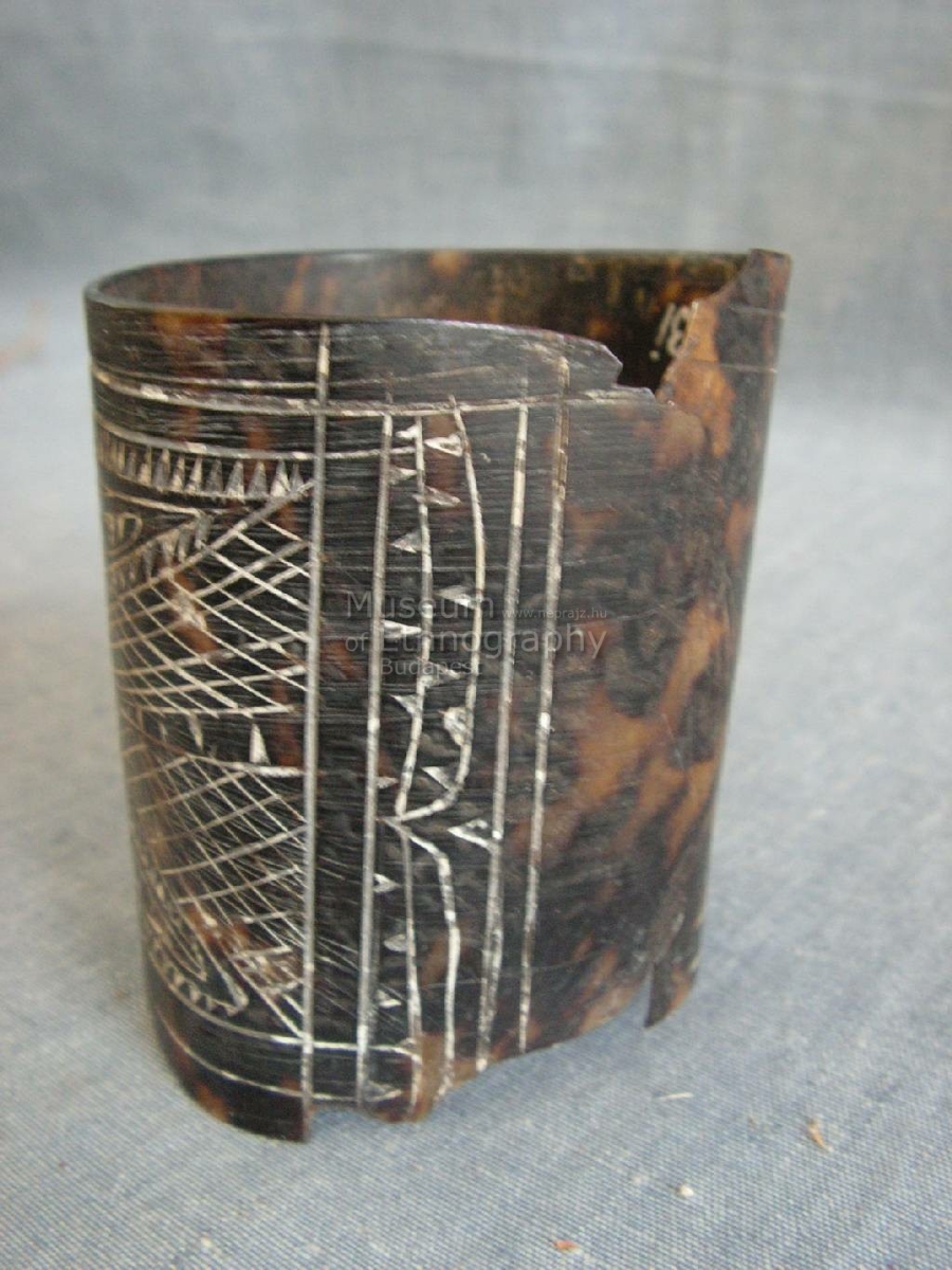 Hengeresre hajlított teknőshéj. Színe sötétbarna világossárga áttetsző foltokkal, végei egymásra hajlanak, a két vége törött. Külső felületét vésett geometrikus mintázat borítja, fehérrel inkusztálva. A vízszintes oldalaival párhuzamosan és félkörben futó vonalak osztják részekre, a sávokat farkasfog, KALIKALI és rácsminta tölti ki.