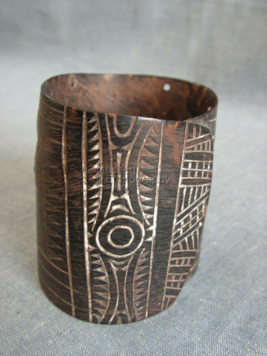 Hengeresre hajlított keskeny teknőshéj. Színe sötétbarna világossárga áttetsző foltokkal, végei egymásra hajlanak. Külső felületén igényesen vésett geometrikus mintázat borítja, kopott inkusztációval. A vízszintes oldalaival párhuzamos vonalak osztják részekre; a középső széles vonalban függőleges vonalak váltakoznak farkasfogmintákkal.