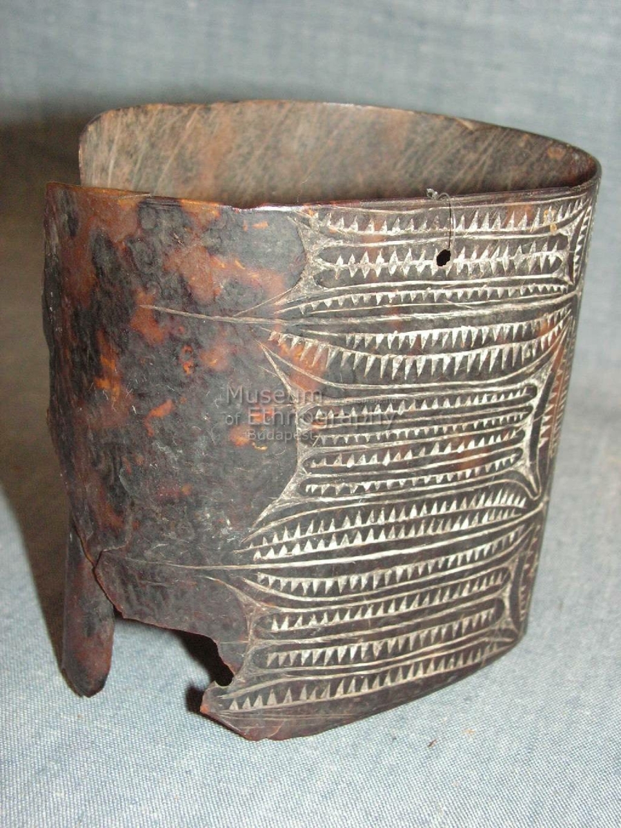 Hengeresre hajlított teknőshéj. Színe sötétbarna világossárga áttetsző foltokkal, végei egymásra hajlanak, szélei töredezettek. Külső felületét vésett geometrikus mintázat borítja, inkusztálva. Két függőleges vonal osztja 3 részre, amelyekben farkasfogsorokkal körülvett vonala adják a mintát.