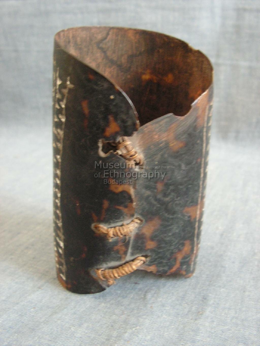 Hengeresre hajlított teknőshéj. Színe sötétbarna világossárga áttetsző foltokkal, végei egymásra hajlanak, három helyen rostfonattal összefűzve. szélet töredezettek. Külső felületén felületesen karcolt geometrikus mintázat borítja, inkusztálva. A vízszintes oldalaival párhuzamos vonalak keretezik a két szélén; a közepén függőleges vonalak osztják ketté amelyeket sréhen álló fogasfogsorok töltenek ki.