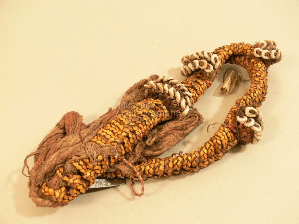 Az öv alapja két párhuzamosan elhelyezett tapacsík, amelyeket aranysárga orchideahánccsal fontak be és össze. külső oldalán négy helyen szintén orchideaháncsból font keresztben és merőlegesen kiálló díszítés van, kiemelkedő részén 2-2 Nassa-csigasorral. A végein a tapacsíkok fedetlenül adják a kötözőrészt. Bíró jegyzet: 516u