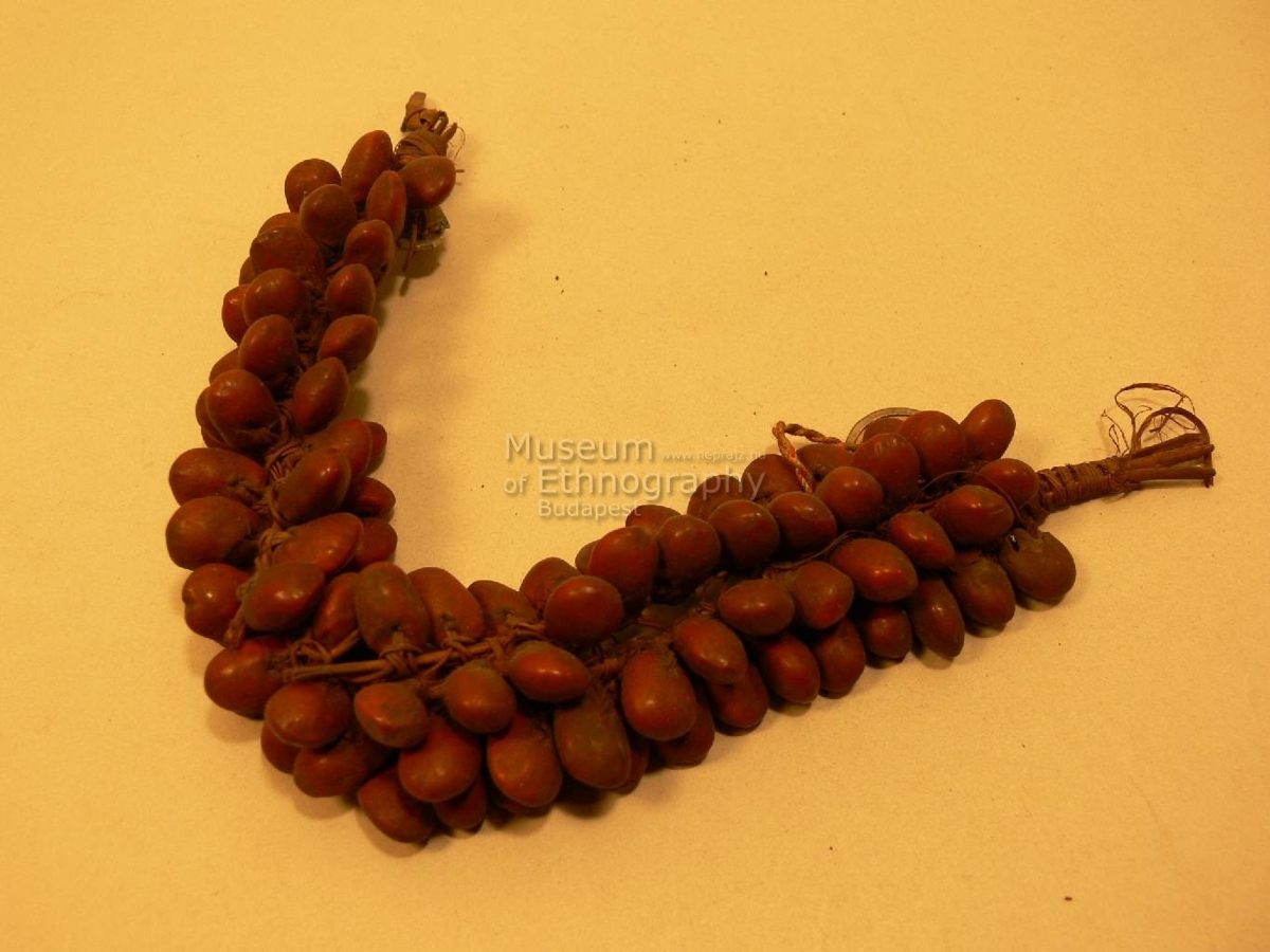 Négy egymáshozfűzött barna spanyolnádosikból álló tárgy, külső részére több sorban piros, babnagyságú, keményhéjú magvak vannak felerősítve.