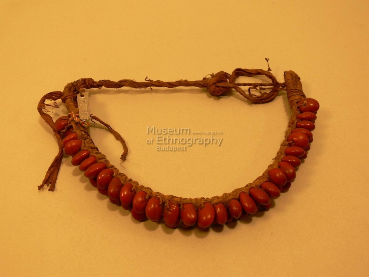 Két keskeny, lapos, világosbarna, rostanyaggal egymáshozkötözött spanyolnádcsíkból álló tárgy, amelynek külső részére két sorban piros, babnagyságú, keményhéjú magvak vannak erősítve. A szalag két végét tapacsikká sodort zsinór köti össze. Biró-jegyzet: 549
