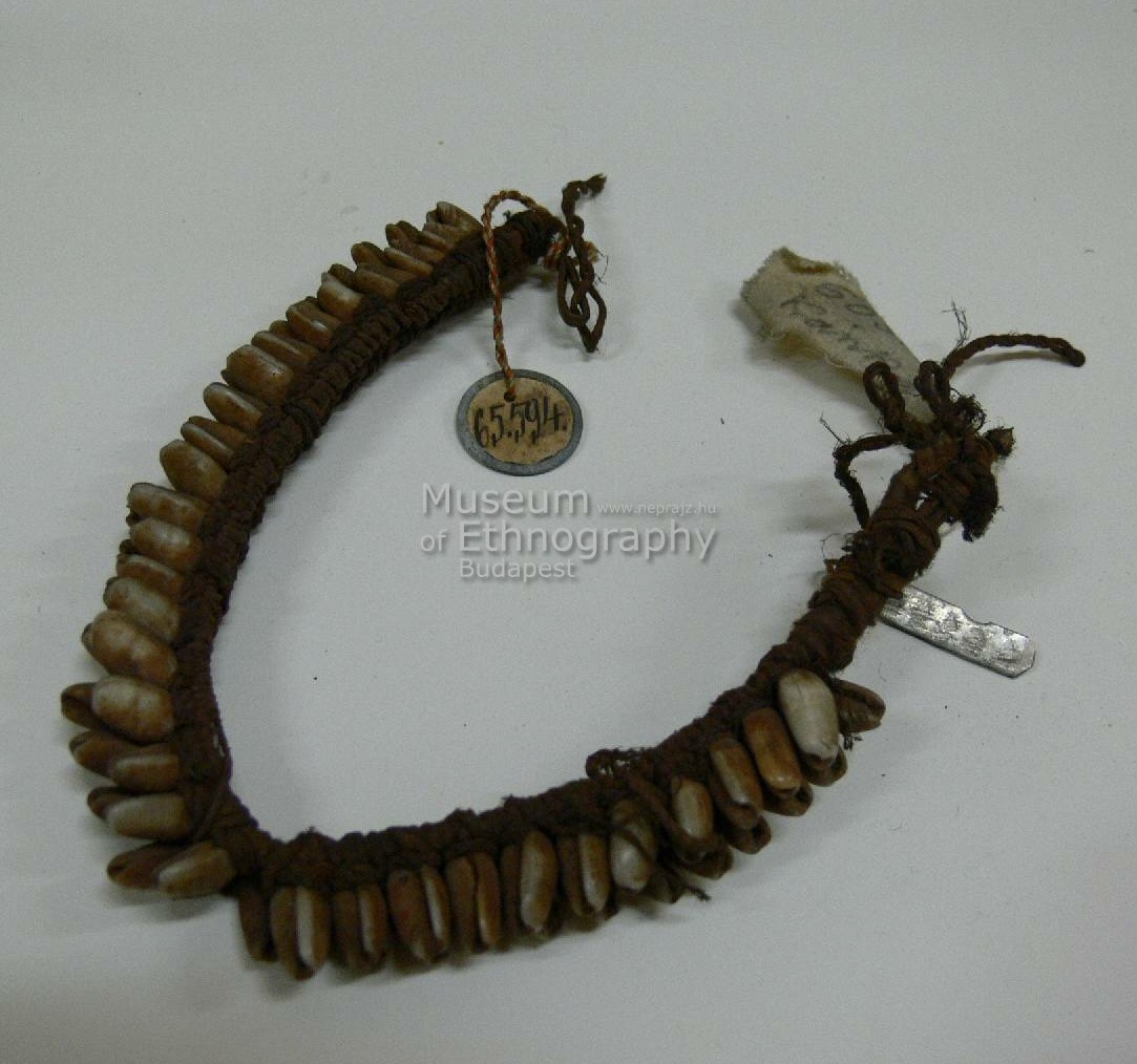 Három keskeny, lapos, világosbarnás szintű, rostanyaggal egymáshozkötött spanyolnádcsikokból álló tárgy, amelynek külső részére három sorban piros szinü, babnagyságu, keményhéjú magvak vannak erösitve. A szalag két vége szorosan fűzött rostszálakkal van egymáshozkötve. Biró-jegyzet: 549.