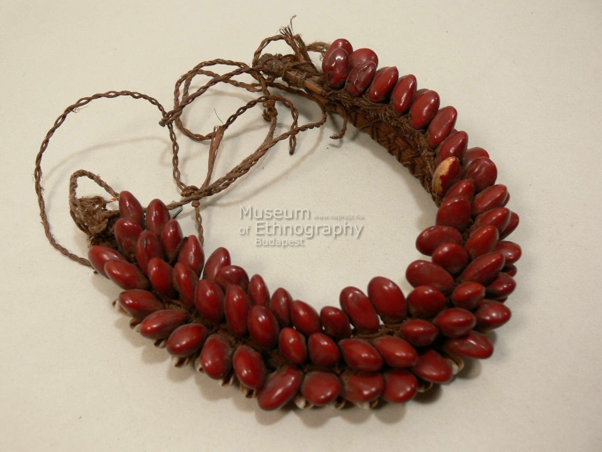 Négy keskeny, rostokkal egymáshoz fűzött lapos, spanyolnádcsikokbol álló tárgy, külső oldalára három sorban piros szinű, babnagyságu, keményhéjú magvak, egy sorban pedig fehéres rózsaszínű csigák vannak felerősítve, Biró-jegyzet: 604