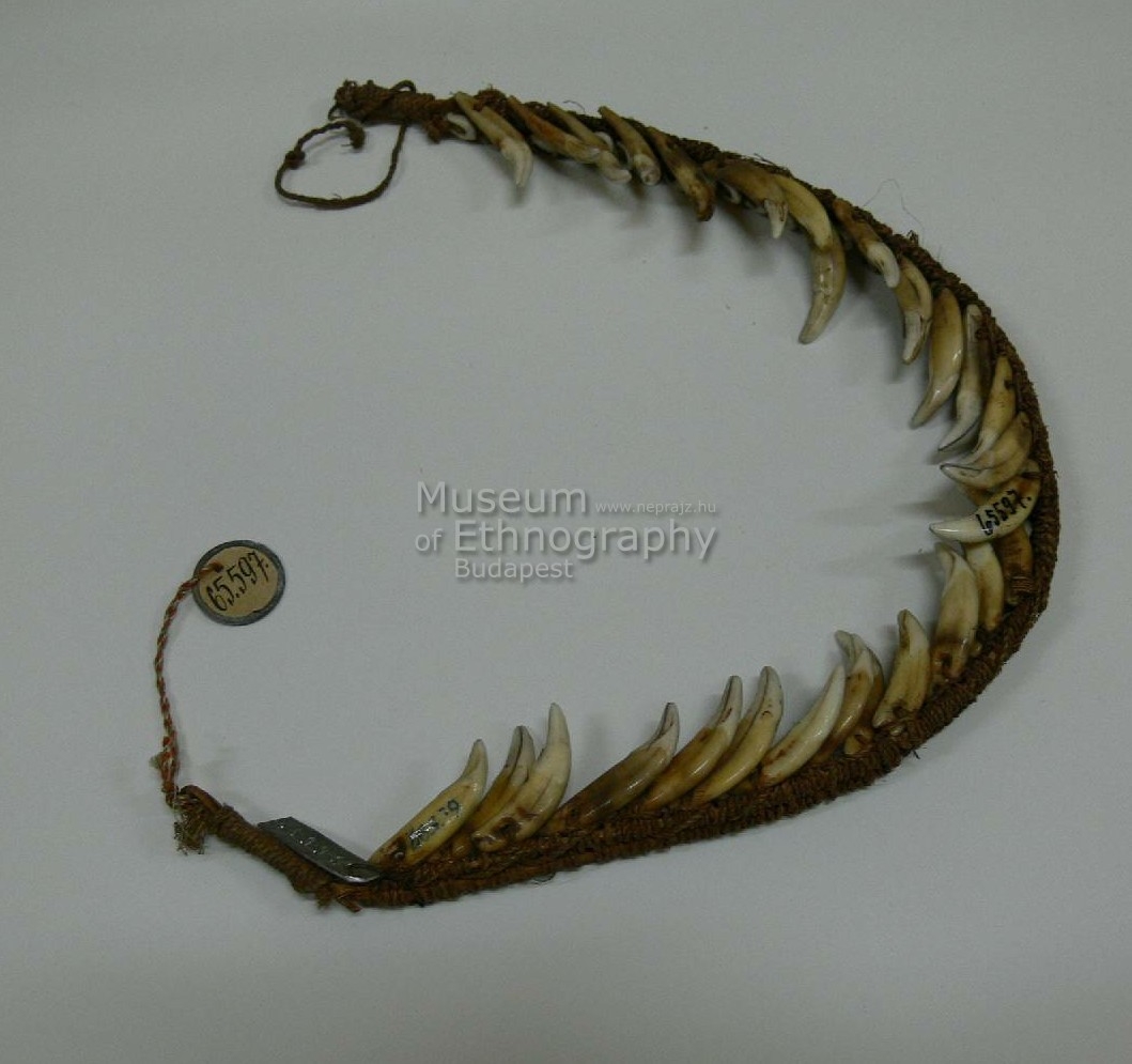 Két egymáshoz fűzött spanyolnádcsikból álló keskeny szál, az alsó részükön lévő lyukon keresztül áthúzott rosttal vannak esszekötve külső peremén két sorban kutyafogak, egy sorban pedig Nassa-csigák vannak ráerősítve. Biró-jegyzet: 547/a.
