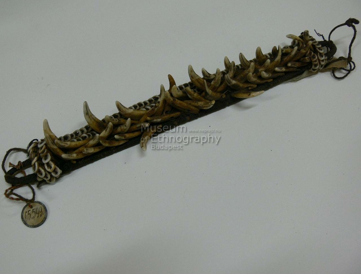 Hat darab kettős, egymáshozkötött két végén hurkosan kiképzett nádcsikból áll, amelyet vékony fekete rostfonalak fűznek össze szövéshez hasonlóan. Külső oldalán felül kettős Nassa-csigasorral van rávarrva. Ez alatt négy sorban váltakozó iránvban elhelyezett kutyafogak vannak felvarrva, soronként ellenkező irányban. Bíró jegyzet: 547/b.
