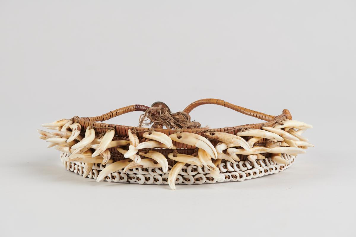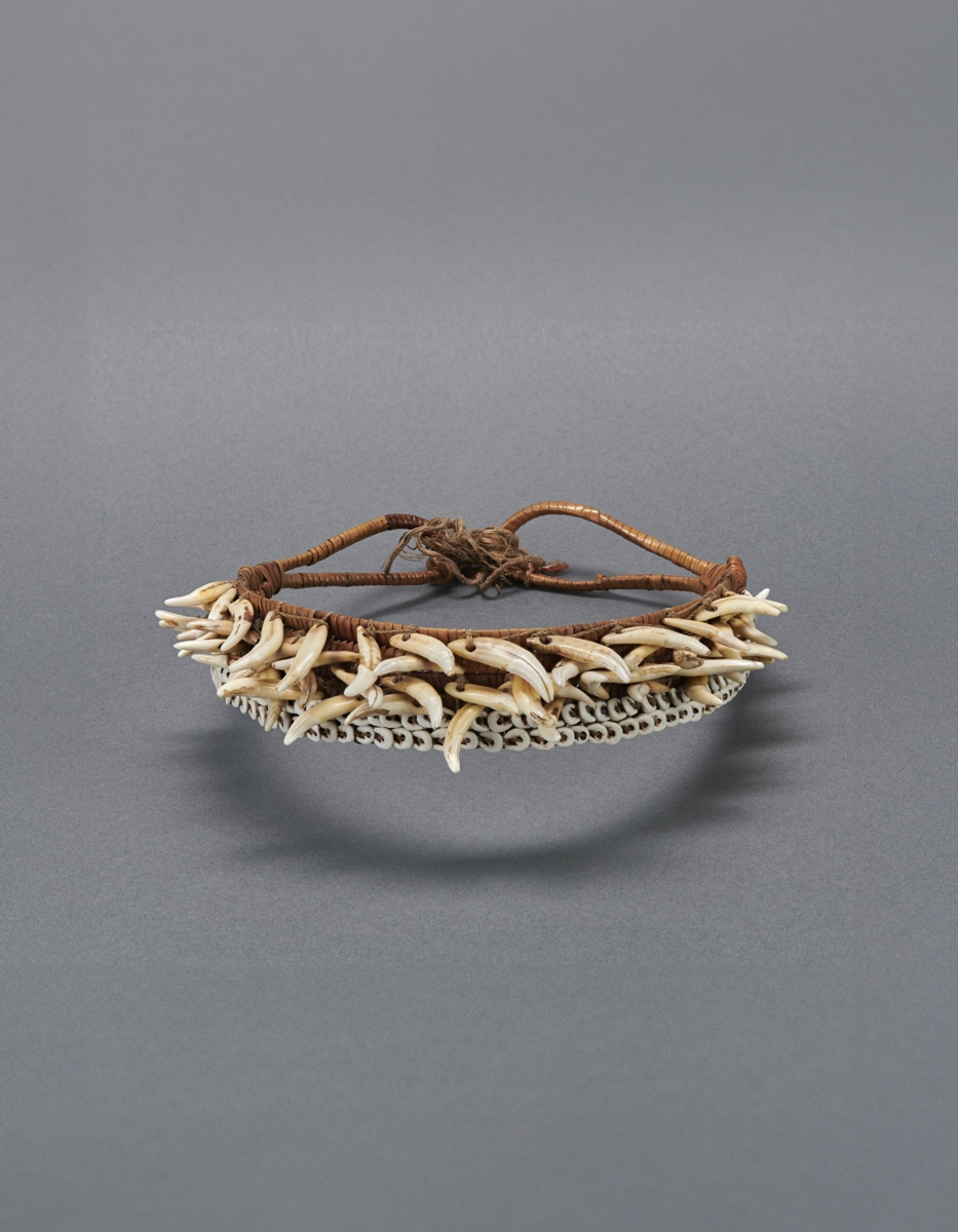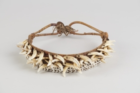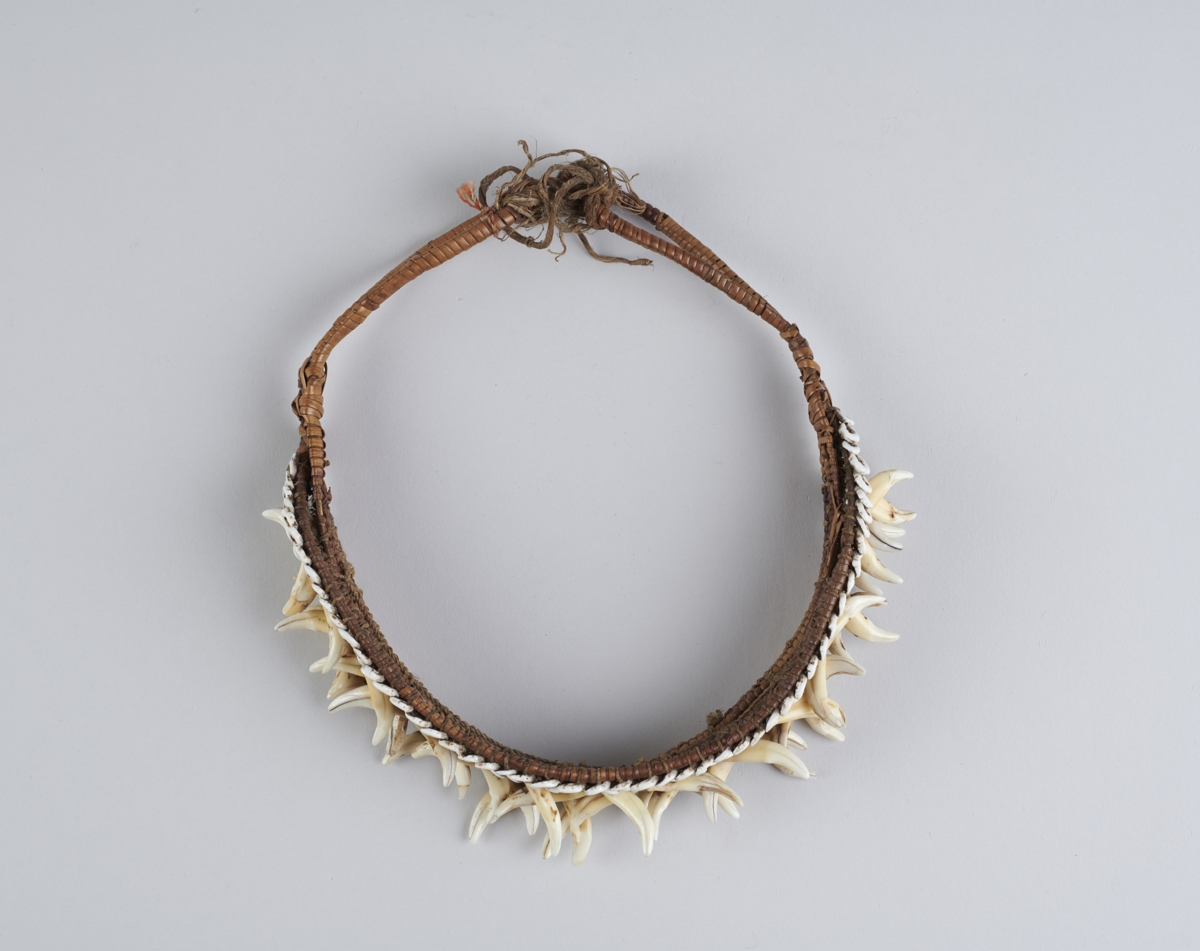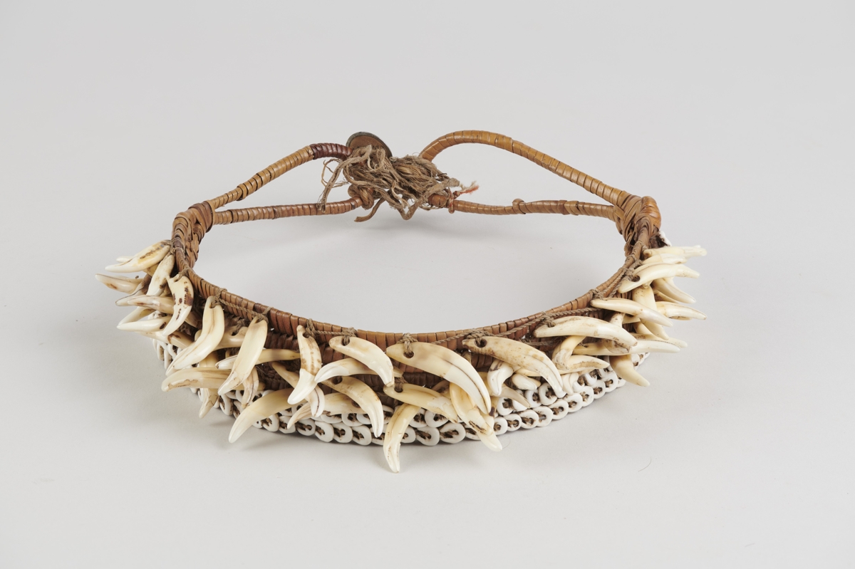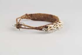 Három darab kettős, egymáshozkötött két végén hurkosan kiképzett nádcsikból áll, amelyet vékony rostfonalak fűznek össze szövéshez hasonlóan. Külső oldalán felül kettős Nassa-csigasorral van rávarrva. Ez alatt négy sorban váltakozó iránvban elhelyezett kutyafogak vannak felvarrva, soronként ellenkező irányban. Bíró jegyzet: 547/c