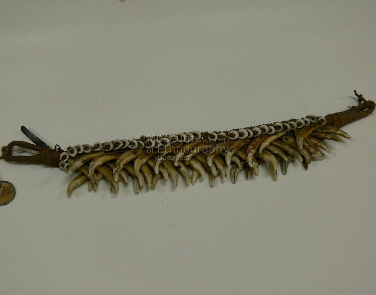 Hét keskeny, két végén hurkosan kiképzett nádcsikból áll, amelyet vékony rostfonalak fűznek össze szövéshez hasonlóan. Díszes oldalán a szélein egy-egy Nassa-csigasor van rávarrva. Középen három sorban kutyafogak vannak felvarrva, soronként ellenkező irányban. Bíró jegyzet: 547/d
