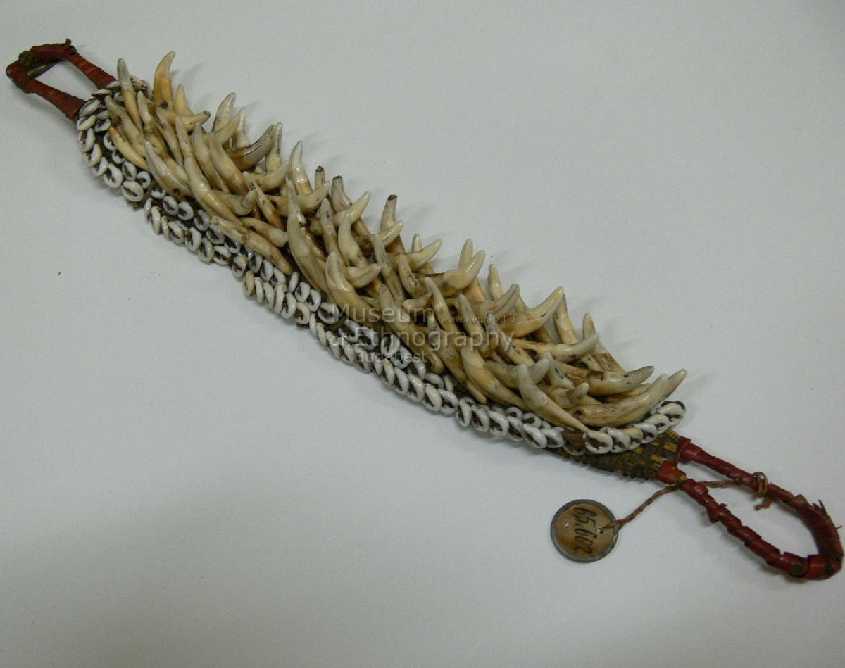 Hét keskeny, két végén hurkosan kiképzett nádcsikból áll, amelyet vékony rostfonalak fűznek össze szövéshez hasonlóan. Díszes oldalán a szélein két-két Nassa-csigasor van rávarrva. Középen öt sorban kutyafogak vannak felvarrva, soronként ellenkező irányban. Bíró jegyzet: 547/d