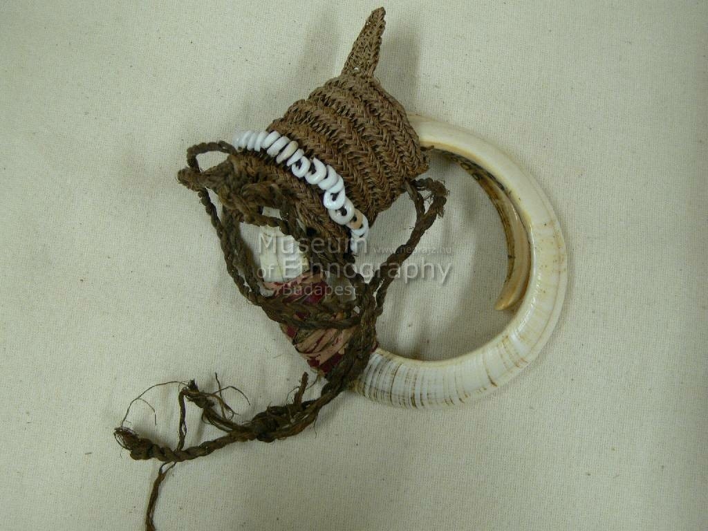 Két félköralakban hajló, fehéres szinü disznóagyarból készített, középen Nassa-csigával diszitett, barnás szinü, széles fonadékkal összeerösített disz. Biró-jegyzet: 559