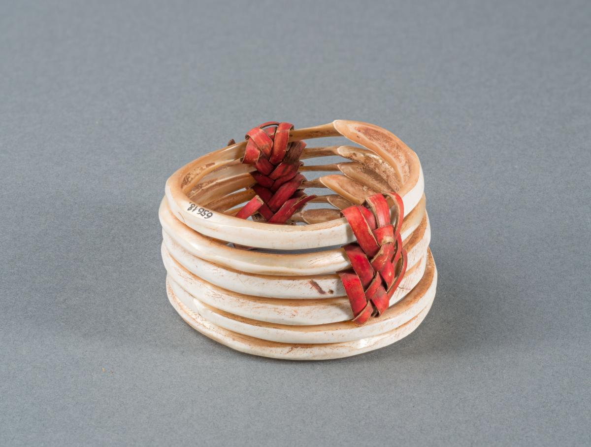 Hat darab csiszolt kagylóperec, egyik oldalukon háromszög alakú nyúlvánnyal, két helyen piros háncsfonattal összefűzve.