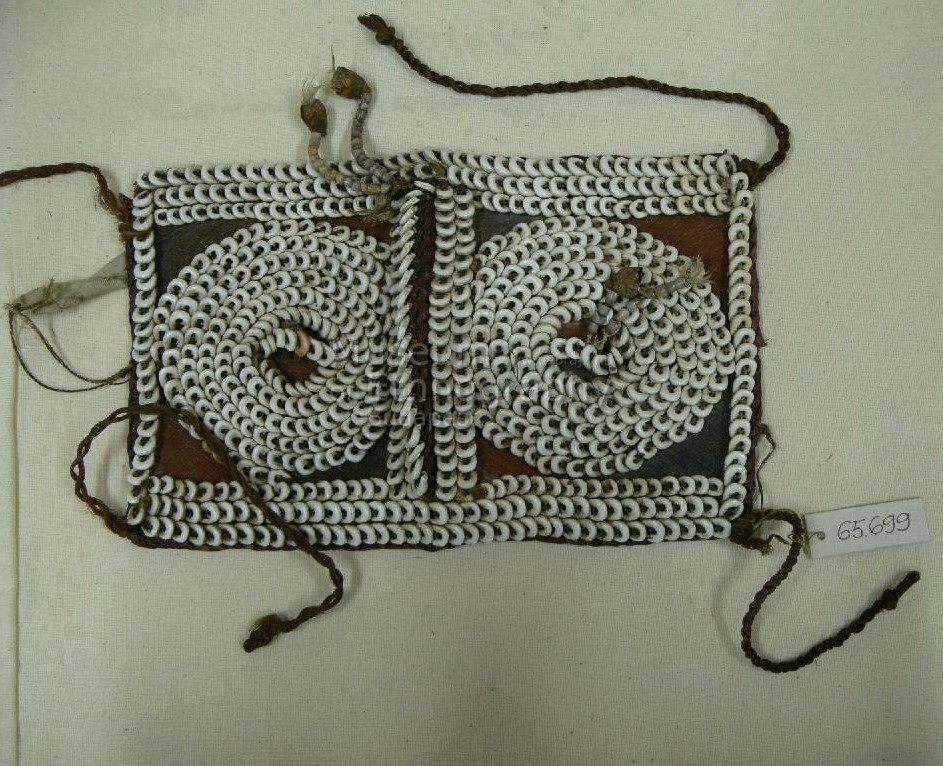 Alapja barna faháncs alakja téglalap. Külső oldala vörös és kékes festése és Nassa-csigákkal ellátva. A díszítés két részre oszthatót mindkét rész négyzetes mezőt alkot, amelyet az oldalakon egy Nassa-csigasor, alul és felül hármas csigasor díszít. Szépen körbefutó csigasor van elhelyezve, csaknem az egész felüleletet beborítja. A csigasor közepéről és a tárgy aljáról kétágú csigafüzér lóg le fehér színü tollakkal díszitve. Bíró jegyzet 635