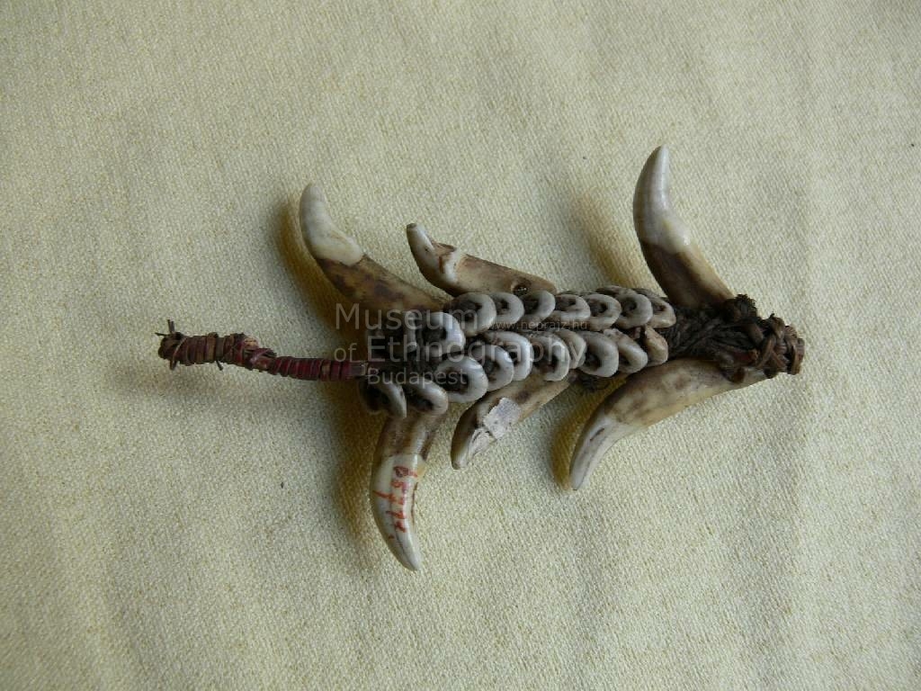 Hat kutyafogból és négy sor Nassa-csigából álló dísz , hosszúkás téglalapformát adva vannak rostfonatra fűzve. A dísz felfüggesztésére piros szinű háncs és háncsfonadék szolgál. Bíró-jegyzet: 533