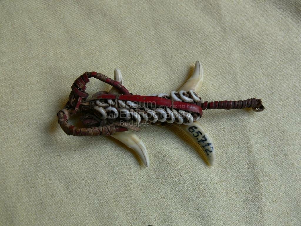 Négy kutyafogból és négy sor Nassa-csigából álló dísz, hosszúkás téglalapformát adva vannak rostfonatra fűzve. A dísz felfüggesztésére piros színű háncs és háncsfonadék szolgál. Bíró-jegyzet: 533