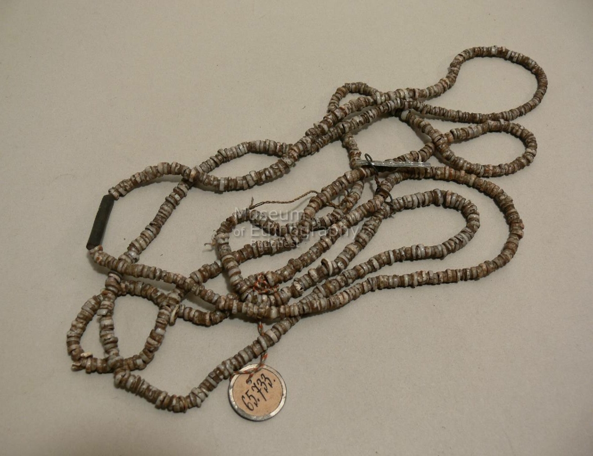Vékony fonálra fűzött, fehéres-szürkés szinü, apró csigákból köszörült, középen átfurt lapos gyöngyökből álló ékszer. Biró-jegyzet: 486
