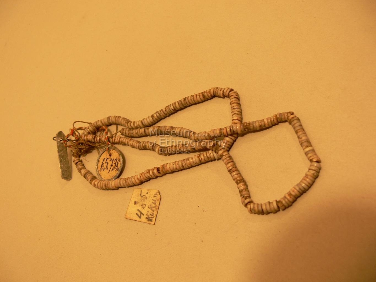 Vékony fonálra fűzött, fehéres-szürkés szlnü, apró csigákból köszörült, középen átfúrt lapos gyöngyökből álló ékszer. Bíró-jegyzet: 485 kikum.