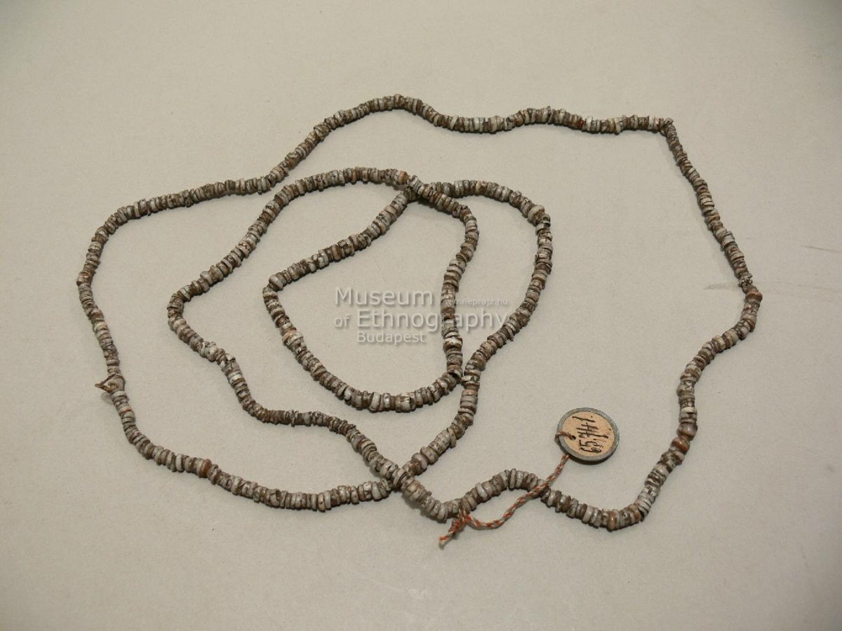 Vékony fonálra fűzött, fehéres-szürkés színű, apró csigákbál köszörült, középen átfúrt, lapos gyöngyökből álló ékszer. Biró -jegyzet: 485 kikum