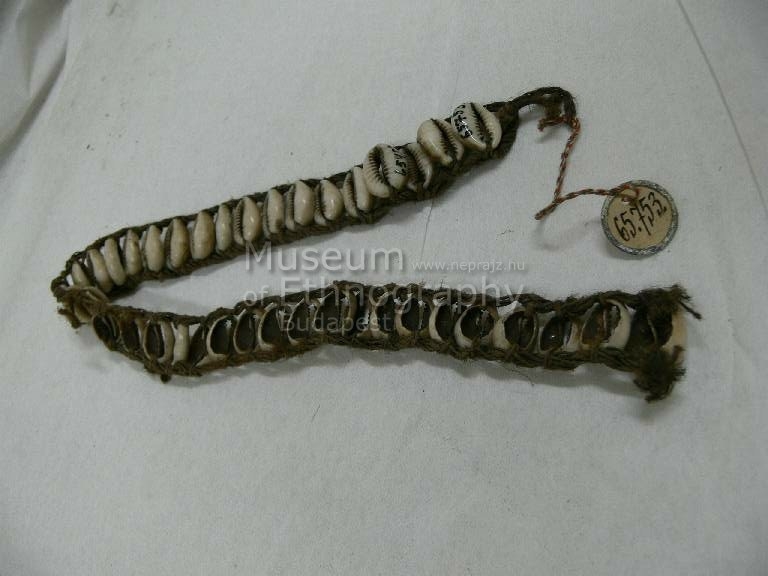 Két fonott rostzsinegre erösített cyprea csigadísz, a csigák a zsinorra merőlegesen a két végüknél vannak felerősitve. Bíró jegyzet 597