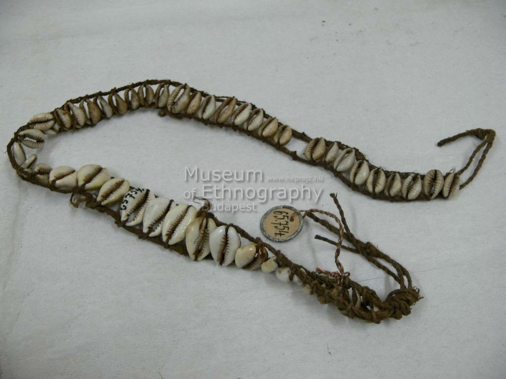 Két fonott rostzsinggre erősített Cyprea csigahéjakból álló dísz, a csigák a zsinorra merőlegesen a két végüknél vannak felerősitve. Bíró-jegyzet: 597