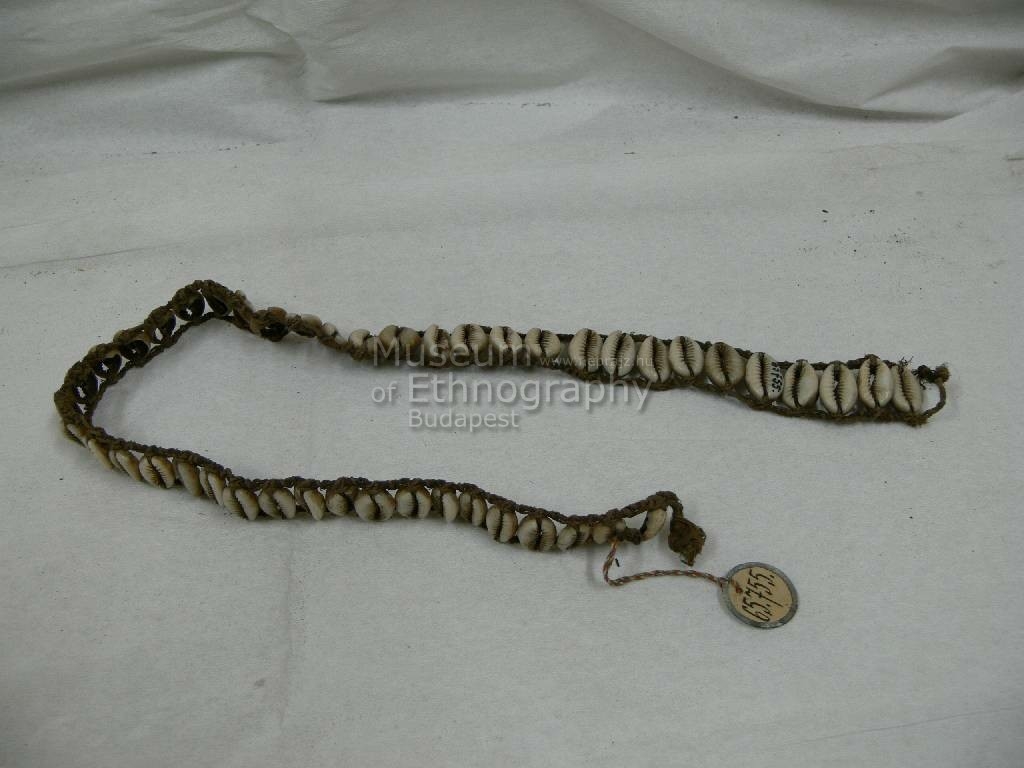Két fonott rostzsinggre erősített Cyprea csigahéjakból álló dísz, a csigák a zsinorra merőlegesen a két végüknél vannak felerősitve. Bíró-jegyzet: 597