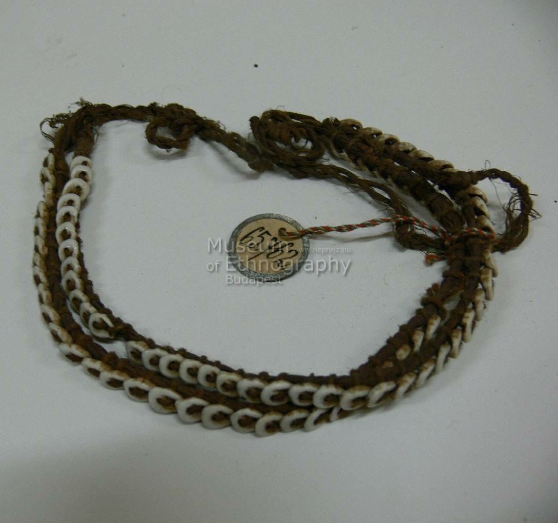 Két fonott rostzsinggre erősített kauricsigahéjakból álló disz, a csigák a zsinorra merőlegesen a két végüknél vannak felerősitve. Bíró jegyzet: 548.
