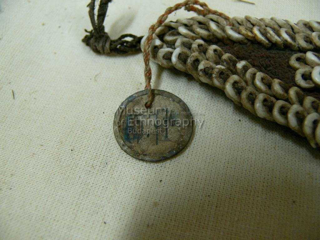 Több rétegben hengerformára összevarrt barnás rostfonat. Külső oldalán Nassa csigákból álló geometrikus minta van varrva, a szabad helyeken vörös és kékes festés. Bíró jegyzet: 574
