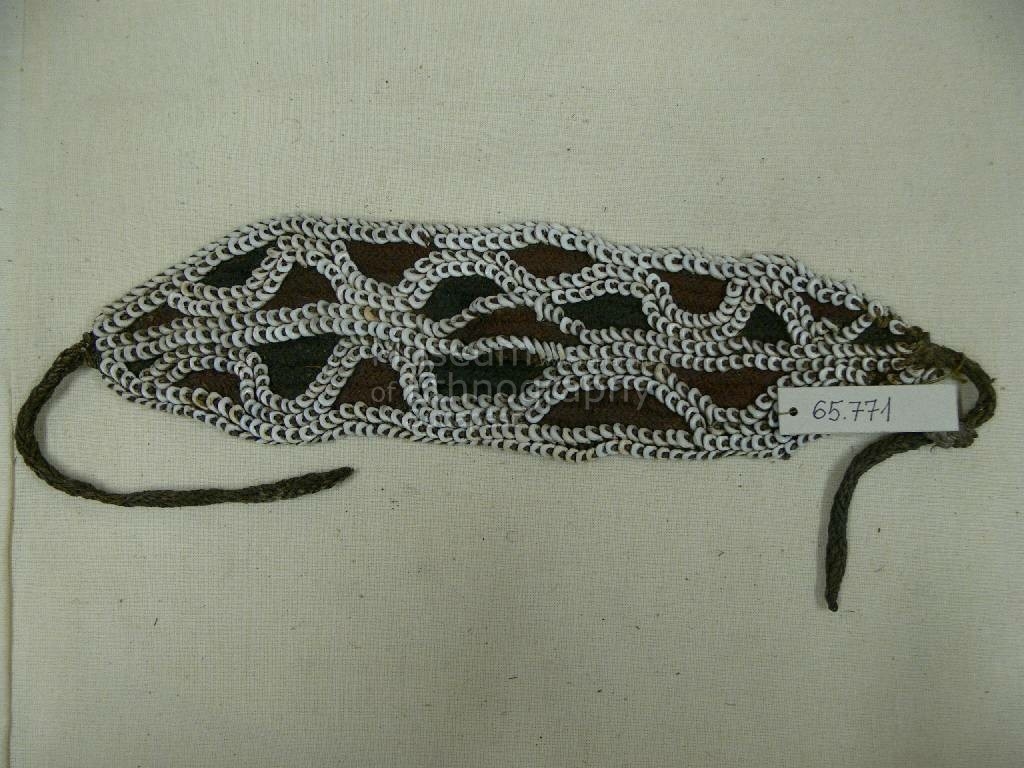 Több rétegben hengerformára összevarrt barnás rostfonat. Külső oldalán kettesével rávarrt Nassa csigadísz ad geometrikus mintát, a szabad helyeken vörös és fekete festés. Két végén az összekötözéshez zsinór.